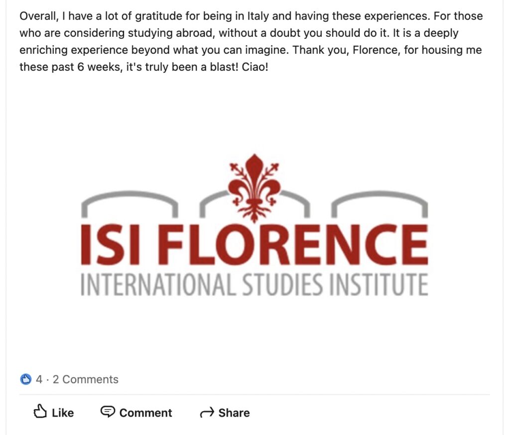 If you’re reading this, I’m seriously so excited for you. Studying abroad in Florence is such a special experience, and I hope you make the most of every second. Enjoy the food, the views, the slow mornings and spontaneous adventures. Soak it all in—you’re in for an amazing few months.