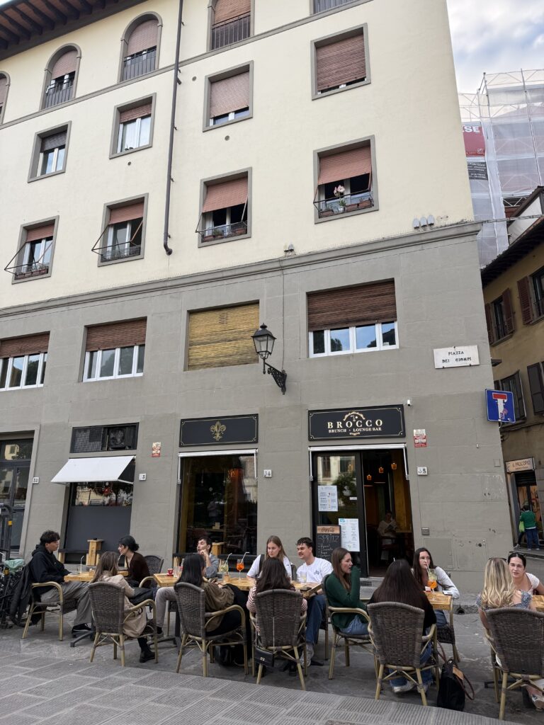 Our apartment is tucked away in Piazza dei Ciompi, only a few blocks away from Santa Croce. Walking out of our apartment, we are greeted with a beautiful piazza, parks, restaurants, and shops. Our favorite restaurant in the square is Brocco, a corner cocktail bar and restaurant. It’s just a thirty-second walk away from our apartment, and the tables outside make it a perfect place to share stories over a 5 euro spritz. As we’ve gone here often, we have gotten to know the people who work there, and we often chat about our days as we wait for our drinks. It has been so nice to have a small restaurant right outside of our apartment to go to for a cheap, delicious drink!